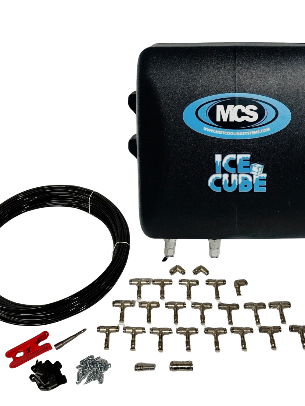 Beat the heat with this bundle. Includes the "Ice Cube" misting pump, designed for residential use but built tough for commercial use, paired with a 40 FT. (20 Nozzle) Mist Line Kit. The perfect combination for backyards and hot patios. Includes everything you need to make installation a breeze. Cool down any outdoor area with this cost effective solution!
