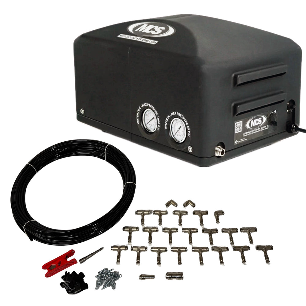 MCS Products .5 GPM Fully Enclosed Misting Pump, proudly made in the USA, paired with a 60ft. (30 Nozzle) Mist Line Kit is just what you need to cool down your outdoor area during those hot summers. This kit includes everything you need to install an outdoor mist line system. With our push-to connect fittings, installation is sure to be a breeze! Kit contents are listed below, but if you have any questions about this product, please call 512-844-8498. We are available Monday - Friday, 8am - 5pm CST.